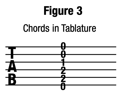 In this example you would play all of the strings at the same time. The first, second and sixth strings would be open. Your first finger would fret the first fret on the third string. The fourth and fifth strings would have fingers on the second frets of each string.